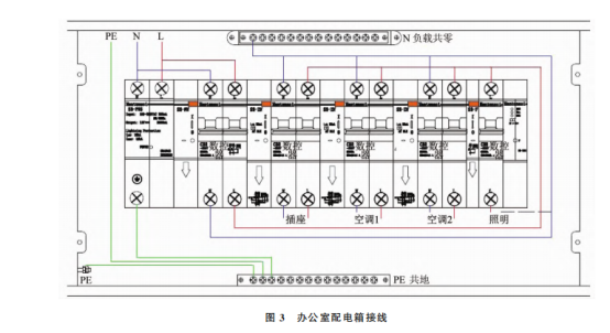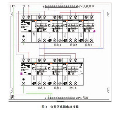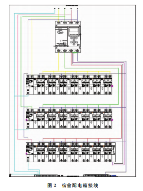 智慧用電監(jiān)管平臺(tái)設(shè)置每個(gè)宿舍由一個(gè)空氣開關(guān)控制,配電箱接線如圖2所示。每個(gè)公室由一個(gè)空氣開關(guān)控制,配電箱接線如圖3所示。每個(gè)公共區(qū)域照明燈由一個(gè)空氣開關(guān)控制,配電箱接線如圖4所示??煞謩e對各回路電流、功率進(jìn)行設(shè)定,當(dāng)回路電流或功率超過限定值時(shí),該回路自動(dòng)跳閘保護(hù)。自由設(shè)定宿舍空調(diào)、照明及插座等每個(gè)回路的開啟和關(guān)閉時(shí)間,通過手機(jī)遠(yuǎn)程管理,同時(shí)可以按鍵自動(dòng)控制,也可以通過手動(dòng)推桿控制通斷電。一旦發(fā)現(xiàn)險(xiǎn)情,立即預(yù)警,并發(fā)送預(yù)警信息至手機(jī)應(yīng)用程序及微機(jī)端。通過告警功能、預(yù)警機(jī)制,及時(shí)發(fā)現(xiàn)配電系統(tǒng)設(shè)備、周圍環(huán)境的異常情況,以便及時(shí)進(jìn)行檢查與維護(hù),防止意外事故發(fā)生。