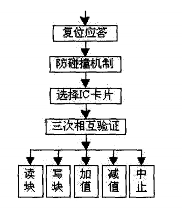 MFRC500能執(zhí)行有限的一些指令,并將這些指令傳輸?shù)?/span>MIFARE1用戶卡片上,單片機對MFRC500的某一指令操作不是簡單的一條指令所能完成的,須有一個程序序列來完成,其中有對MFRC500硬件內(nèi)核寄存器的設(shè)置以及判斷。在進行讀寫數(shù)據(jù)或增、減值操作之前還須經(jīng)過復位應答、防碰撞、選卡及認證過程。操作流程圖如圖6所示。本設(shè)計釆用基于Keil C的C語言進行編程,調(diào)用Philips公司提供的基本庫函數(shù)來實現(xiàn)各種功能。
