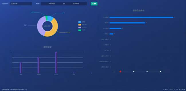 數(shù)據(jù)進(jìn)行關(guān)聯(lián)分析,對(duì)超標(biāo)的種類(lèi)、企業(yè)進(jìn)行餅狀圖的展示,同時(shí)對(duì)報(bào)警企業(yè)進(jìn)行排名,根據(jù)排名情況對(duì)相關(guān)企業(yè)進(jìn)行數(shù)據(jù)和運(yùn)行狀態(tài)的分析評(píng)價(jià)。