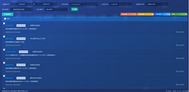 后臺(tái)根據(jù)測(cè)點(diǎn)設(shè)置的濃度閾值以及門(mén)限時(shí)間在隱患巡查中產(chǎn)生對(duì)應(yīng)的報(bào)警信息,并在首頁(yè)進(jìn)行鈴鐺和語(yǔ)音提示。企業(yè)用戶(hù)對(duì)隱患進(jìn)行確認(rèn),確認(rèn)工單派發(fā)對(duì)象,工單截至期限,以及工單任務(wù)描述;運(yùn)維人員確認(rèn)工單內(nèi)容并對(duì)隱患進(jìn)行處理,填寫(xiě)處理結(jié)果詳情,上傳現(xiàn)場(chǎng)圖片等附件或進(jìn)行二級(jí)派發(fā);相關(guān)企業(yè)用戶(hù)可在