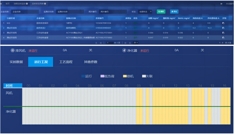 實(shí)時(shí)監(jiān)控:運(yùn)行工況;實(shí)時(shí)監(jiān)測(cè)數(shù)據(jù)包括油煙凈化器和風(fēng)機(jī)的運(yùn)行電流,根據(jù)電流數(shù)值來(lái)判斷當(dāng)前進(jìn)化器的運(yùn)行狀態(tài),包括失聯(lián)、停機(jī)、運(yùn)行等狀態(tài),結(jié)合運(yùn)行數(shù)據(jù)曲線(xiàn),更加方便直觀。