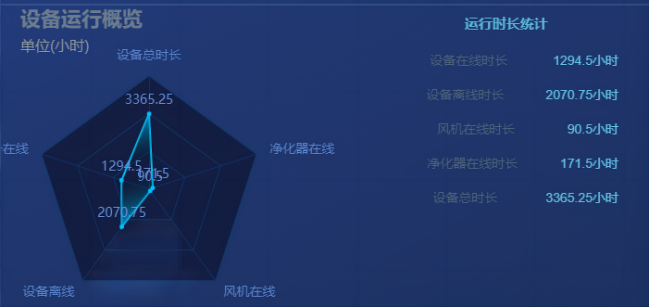 企業(yè)在線(xiàn)時(shí)長(zhǎng)報(bào)告模塊,將企業(yè)目前監(jiān)測(cè)儀的在線(xiàn)時(shí)長(zhǎng),失聯(lián)時(shí)長(zhǎng),風(fēng)機(jī)、凈化器的在線(xiàn)、離線(xiàn)時(shí)間進(jìn)行匯總,以折線(xiàn)圖、雷達(dá)圖的形式展示。