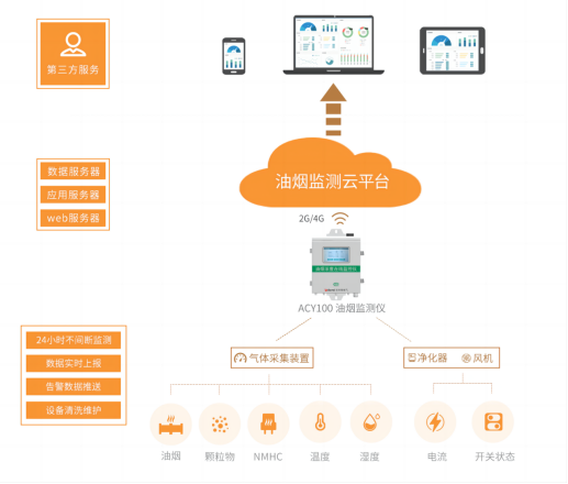 實(shí)時(shí)監(jiān)測(cè)數(shù)據(jù)包括油煙凈化器和風(fēng)機(jī)的運(yùn)行電流,油煙濃度、顆粒物濃度和