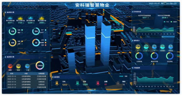 例如下圖所示的智慧物業(yè)駕駛艙,內(nèi)容有:預(yù)付費、充電樁、電梯、空調(diào)、照明等設(shè)備管理、能耗統(tǒng)計、收益統(tǒng)計、運維情況等。其中百度地圖可以選配成