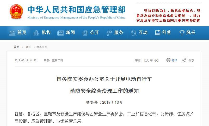 日國務(wù)院發(fā)布《國務(wù)院安委會(huì)辦公室關(guān)于開展電動(dòng)自行車消防安全綜合治理工作的通知》開展電動(dòng)自行車消防安全綜合治理工作。
