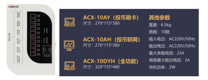 其中ACX-10AY投幣刷卡型可通過投幣和刷卡充電,刷卡充電需要在管理處預(yù)存電費(fèi)充值;