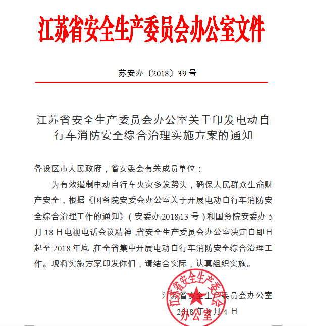 2018515日國(guó)務(wù)院發(fā)布《國(guó)務(wù)院安委會(huì)辦公室關(guān)于開(kāi)展電動(dòng)自行車(chē)消防安全綜合治理工作的通知》開(kāi)展電動(dòng)自行車(chē)消防安全綜合治理工作。