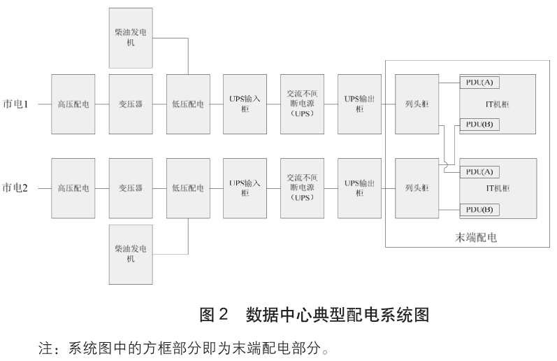 數(shù)據(jù)中心要實現(xiàn)持續(xù)穩(wěn)定運行,前提是其供電系統(tǒng)應(yīng)穩(wěn)定可靠、不間斷。當(dāng)前,重要程度高的A級數(shù)據(jù)中心一般采用2N架構(gòu)的UPS供電方式,以實現(xiàn)容錯要求,供電系統(tǒng)包括高低壓配電、后備發(fā)電機組、不間斷電源、后備蓄電池、精密配電等子系統(tǒng),典型的數(shù)據(jù)中心供電系統(tǒng)如圖1所示。