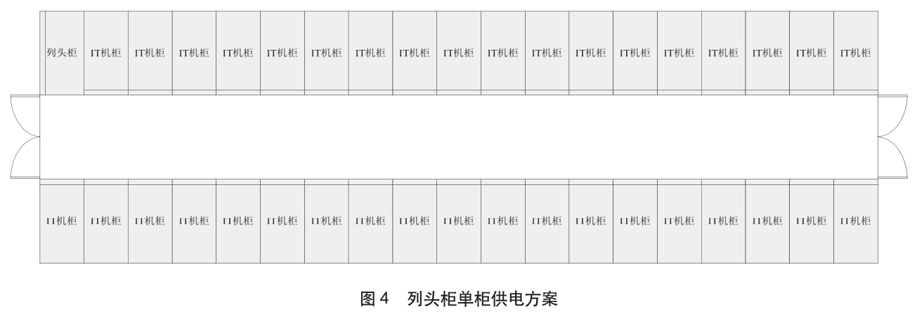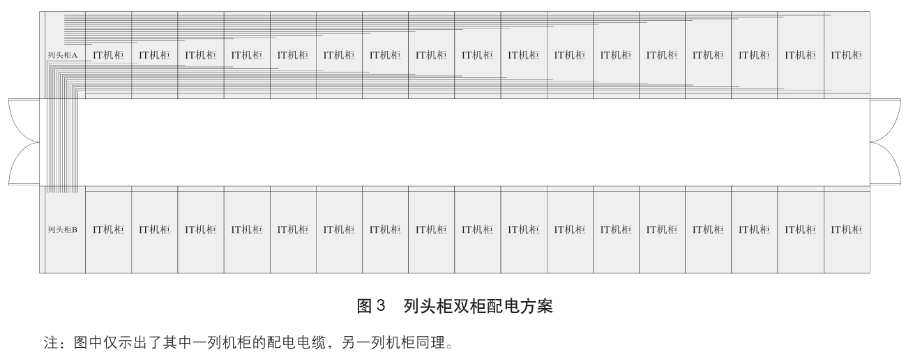IT機柜的供電方式為:每個IT機柜內(nèi)包括兩路PDU,PDU(A) 和PDU(B),其中PDU(A)通過電纜由列頭柜A取電,PDU(B)通過電纜由列頭柜B取電。