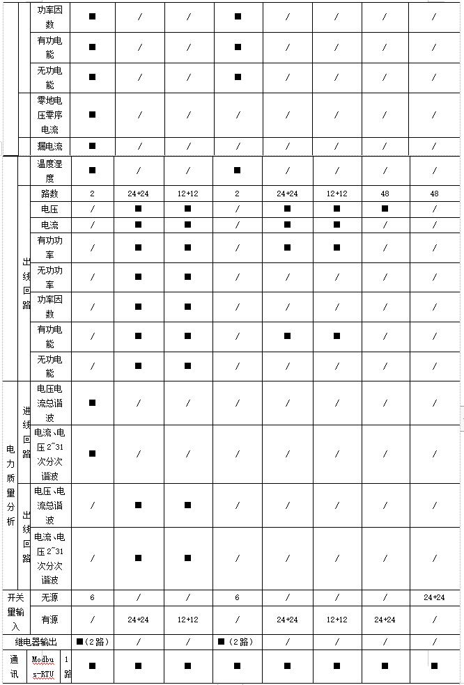 遙信:過電流2段閥值越限、過/欠壓、過功率告警、缺相、過頻率、欠頻率越限、零地電壓、零線電流、溫/濕度告警,開關(guān)狀態(tài)、開關(guān)跳閘;