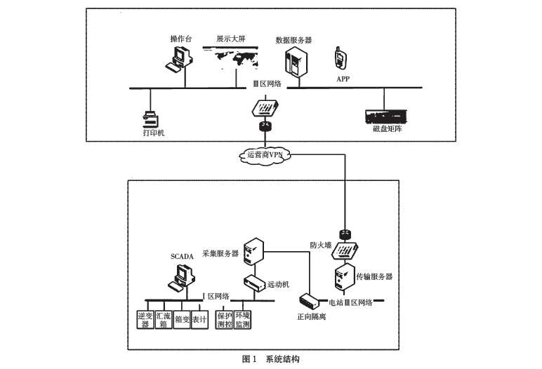 一層:總部集中管理中心層,部署大數(shù)據(jù)智能運(yùn)維平臺(tái),接收站端上傳的實(shí)時(shí)生產(chǎn)運(yùn)行數(shù)據(jù)、站端主要設(shè)備的運(yùn)行參數(shù)等數(shù)據(jù),對(duì)站端上傳的數(shù)據(jù)進(jìn)行多層次、多維度綜合分析處理、存儲(chǔ)、應(yīng)用、展示及發(fā)布,評(píng)估電站生產(chǎn)運(yùn)行情況,并提供生產(chǎn)運(yùn)行報(bào)表;實(shí)現(xiàn)對(duì)下屬多個(gè)電站的統(tǒng)一監(jiān)視和管理。二層:站端數(shù)據(jù)采集層,建設(shè)在電站就地,通過在生產(chǎn)控制一區(qū)部署通信管理機(jī)接收電站SCADA 監(jiān)控系統(tǒng)后臺(tái)轉(zhuǎn)發(fā)的逆變器、匯流箱、升壓站遙測(cè)和電能計(jì)量表(安全Ⅱ區(qū))、環(huán)境監(jiān)測(cè)儀數(shù)據(jù),并經(jīng)過橫向隔離裝置(正向型)傳輸?shù)焦芾硇畔^(qū)的數(shù)據(jù)服務(wù)器,位于服務(wù)器中的解析程序?qū)魅氲臄?shù)據(jù)進(jìn)行實(shí)時(shí)解析、入庫和統(tǒng)計(jì)分析。