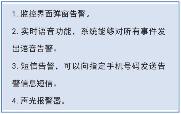 告警功能:在監(jiān)控中心對(duì)環(huán)境參量超過(guò)預(yù)設(shè)值時(shí)發(fā)出視聽(tīng)告警,在監(jiān)控系統(tǒng)的人機(jī)界面上閃爍顯示,同時(shí)可以提供警示燈、報(bào)警音箱、語(yǔ)音、短信通知等多種告警方式。