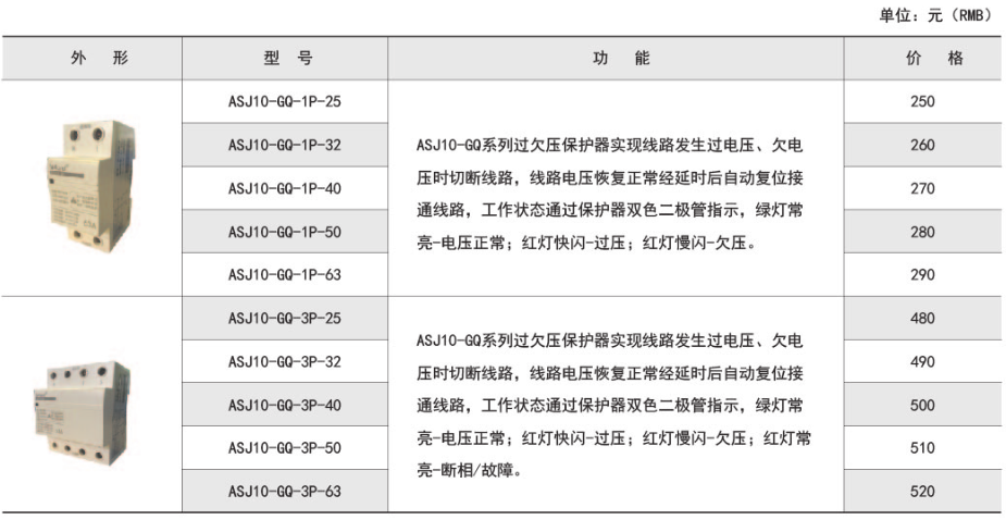 ASJ10-GQ系列自復(fù)式過欠壓保護(hù)器(以下簡稱ASJ),適用于單相交流電壓230V或三相電壓400V,頻率50Hz,額定工作電流至63A及以下的用戶或負(fù)載。由中性線故障引起的單相或三相線路過、欠電壓時,保護(hù)器對用電設(shè)備進(jìn)行保護(hù)。