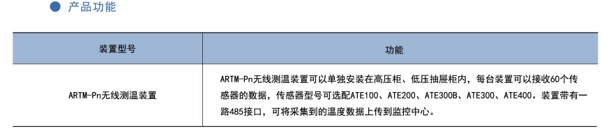 ARTM-Pn無線測(cè)溫裝置:ARTM-Pn無線測(cè)溫裝置可以單獨(dú)安裝在高壓柜、低壓抽屜柜內(nèi),每臺(tái)裝置可以接收18個(gè)傳感器的數(shù)據(jù),傳感器型號(hào)可選配ATE100、ATE200、ATE300。裝置帶有一路485接口,可將采集到的溫度數(shù)據(jù)上傳到監(jiān)控中心。