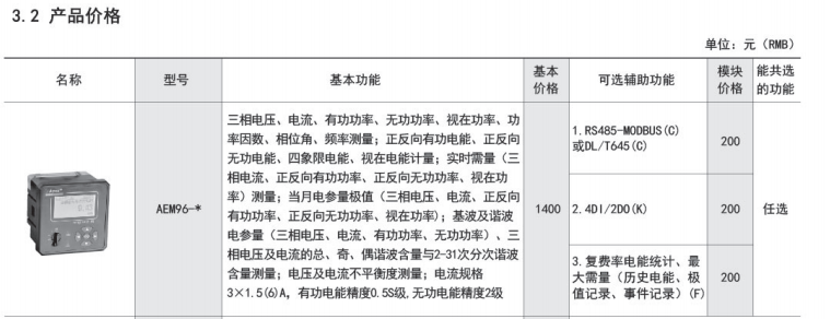 AEM 三相嵌入式多功能電能表,是主要針對電力系統(tǒng),工礦企業(yè),共用設施的電能統(tǒng) 計、管理需求而設計的一款智能儀表,產(chǎn)品具有精度高、體積小、安裝方便等優(yōu)點。集成全 部電力參數(shù)測量及全面的電能計量及考核管理,提供上 24 時、上 31 日以及上 12 月的各類 電能數(shù)據(jù)統(tǒng)計。具有 31 次分次諧波與總諧波含量檢測,帶有開關(guān)量輸入和繼電器輸出可實 現(xiàn)“遙信”和“遙控”功能,并具備報警輸出。帶有 RS485 通信接口,可選用 MODBUS‐RTU 或 DL/T645‐2007 協(xié)議。本系列包括 96 型、42 型兩種規(guī)格,其中 42 型還具有零線電流測量 功能。該電力儀表可廣泛應用于各種控制系統(tǒng),SCADA 系統(tǒng)和能源管理系統(tǒng)中。