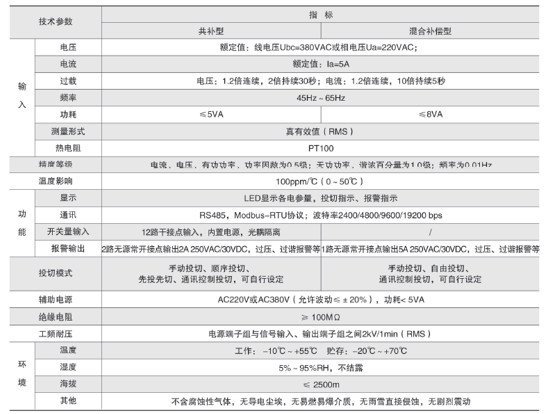 技術(shù)要求:輸入三相電壓AC220V;輸入電流AC5A;投切方式順序投切;補(bǔ)償方式三相共補(bǔ);投切控制路數(shù)6路;開關(guān)量輸入6路;柜內(nèi)溫度檢測。