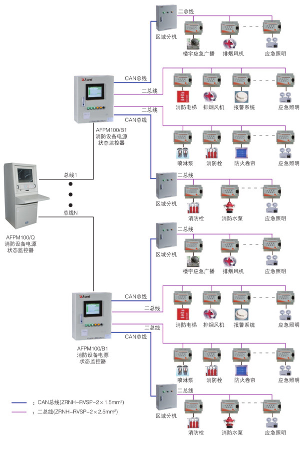 接收消防電源監(jiān)控模塊采集的電壓、電流信號,判斷電源設備的故障信息,實現(xiàn)對被保護消防設備電源的監(jiān)視,報警,控制與管理,采用二總線通訊 |