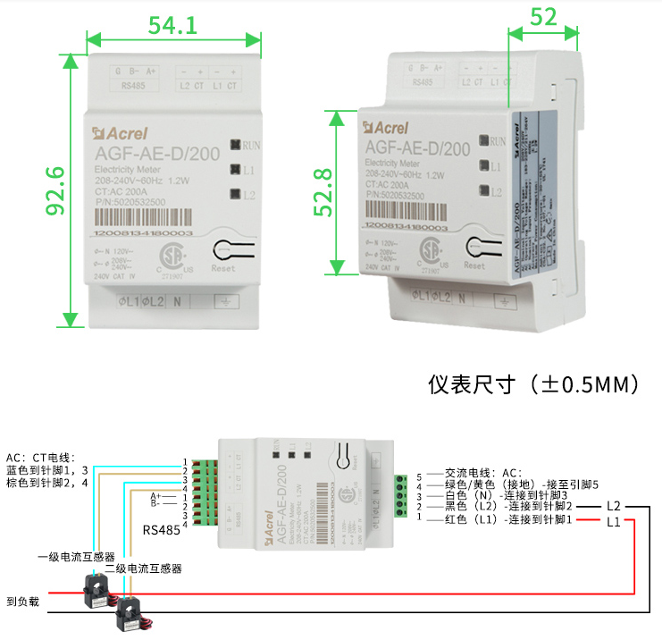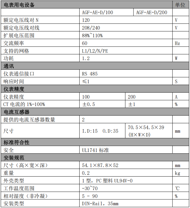 電流測(cè)量范圍為CT額定值的1%~100%,100A表精度可達(dá)±0.5%,200A表為±1%;