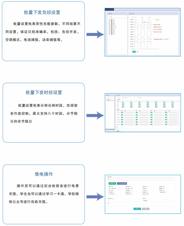 高校宿舍預付費電控系統(tǒng)集電能計量、收費管理、用電過程管理等功能于一體,具備遠程實時抄表計量、控制學生作息、惡性負載識別預警、校園一卡通自助繳費、微信查詢、打印用能報表等功能,創(chuàng)建節(jié)約校園、安全校園,方便校方進行一體化、信息化管理,并支持和智慧校園系統(tǒng)的數(shù)據(jù)對接。