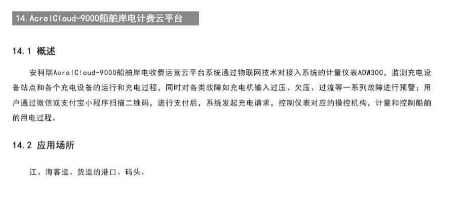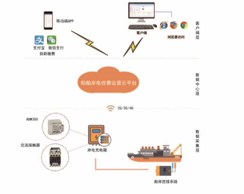 安科瑞AcrelCloud-9000船舶岸電收費(fèi)運(yùn)營(yíng)云平臺(tái)系統(tǒng)通過(guò)物聯(lián)網(wǎng)技術(shù)對(duì)接入系統(tǒng)的計(jì)量?jī)x表ADW300,監(jiān)測(cè)充電設(shè)備站點(diǎn)和各個(gè)充電設(shè)備的運(yùn)行和 充電過(guò)程,同時(shí)對(duì)各類故障如充電機(jī)輸入過(guò)壓、欠壓、過(guò)流等一系列故障進(jìn)行預(yù)警;用戶通過(guò)微信或者支付寶小程序掃描二維碼,進(jìn)行支付后,系統(tǒng)發(fā)起充電請(qǐng)求,控制儀表對(duì)應(yīng)的操控機(jī)構(gòu),計(jì)量和控制船舶的用電過(guò)程。
